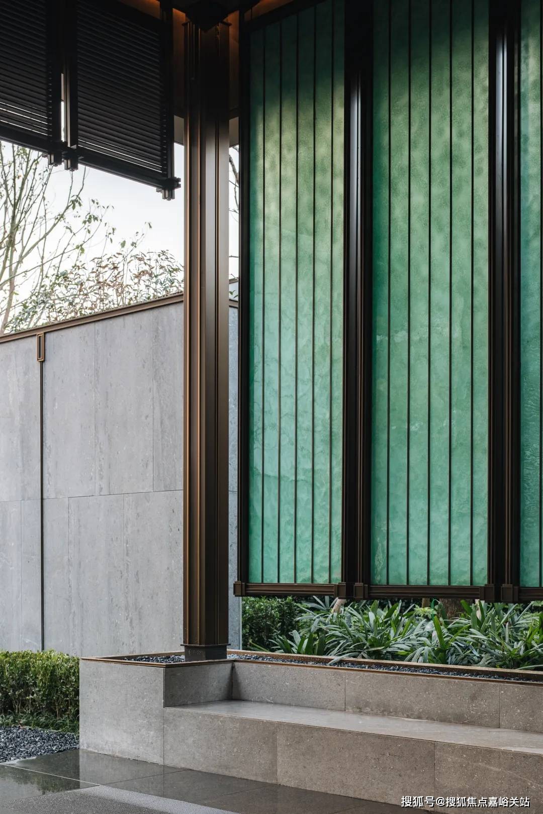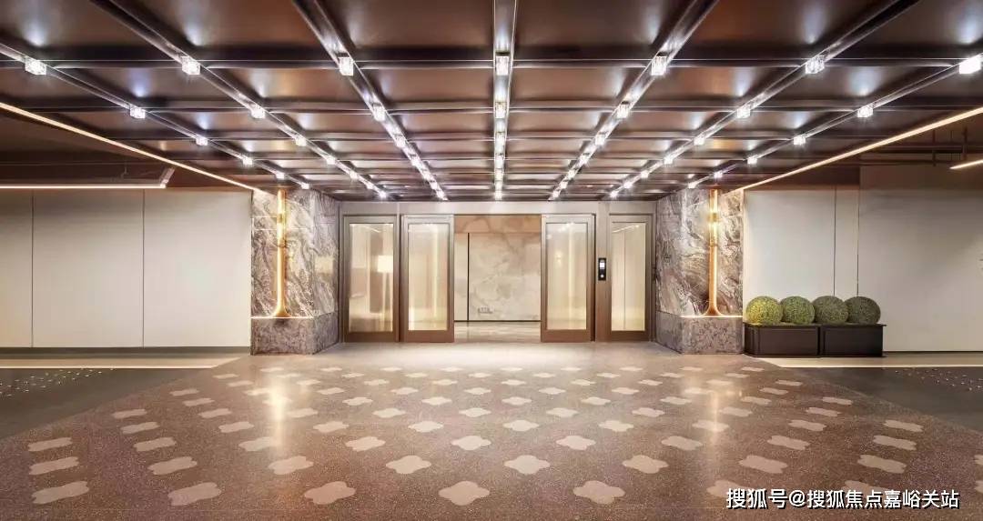 在门头及入户大堂的用材上:单元门头整体和小区入口大堂呼应,两侧采用大象灰石材哑光面和拉槽面,搭配定制龙鳞纹金属网,带给业主的出入间的仕第门庭礼序,呈现了现代东方的城市风骨,尊贵感油然而生。