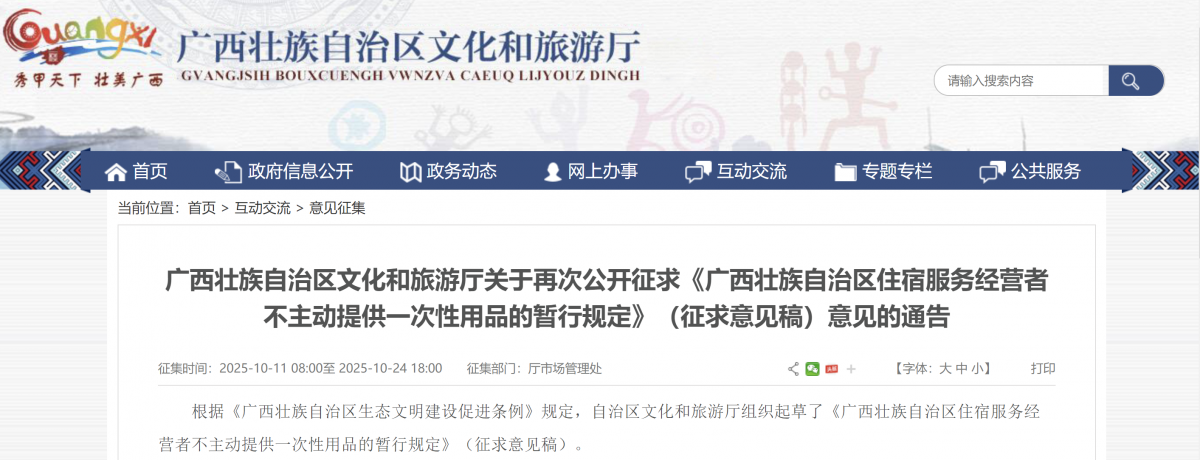 根据《广西壮族自治区生态文明建设促进条例》规定,自治区文化和旅游厅组织起草了《广西壮族自治区住宿服务经营者不主动提供一次性用品的暂行规定》(征求意见稿)。