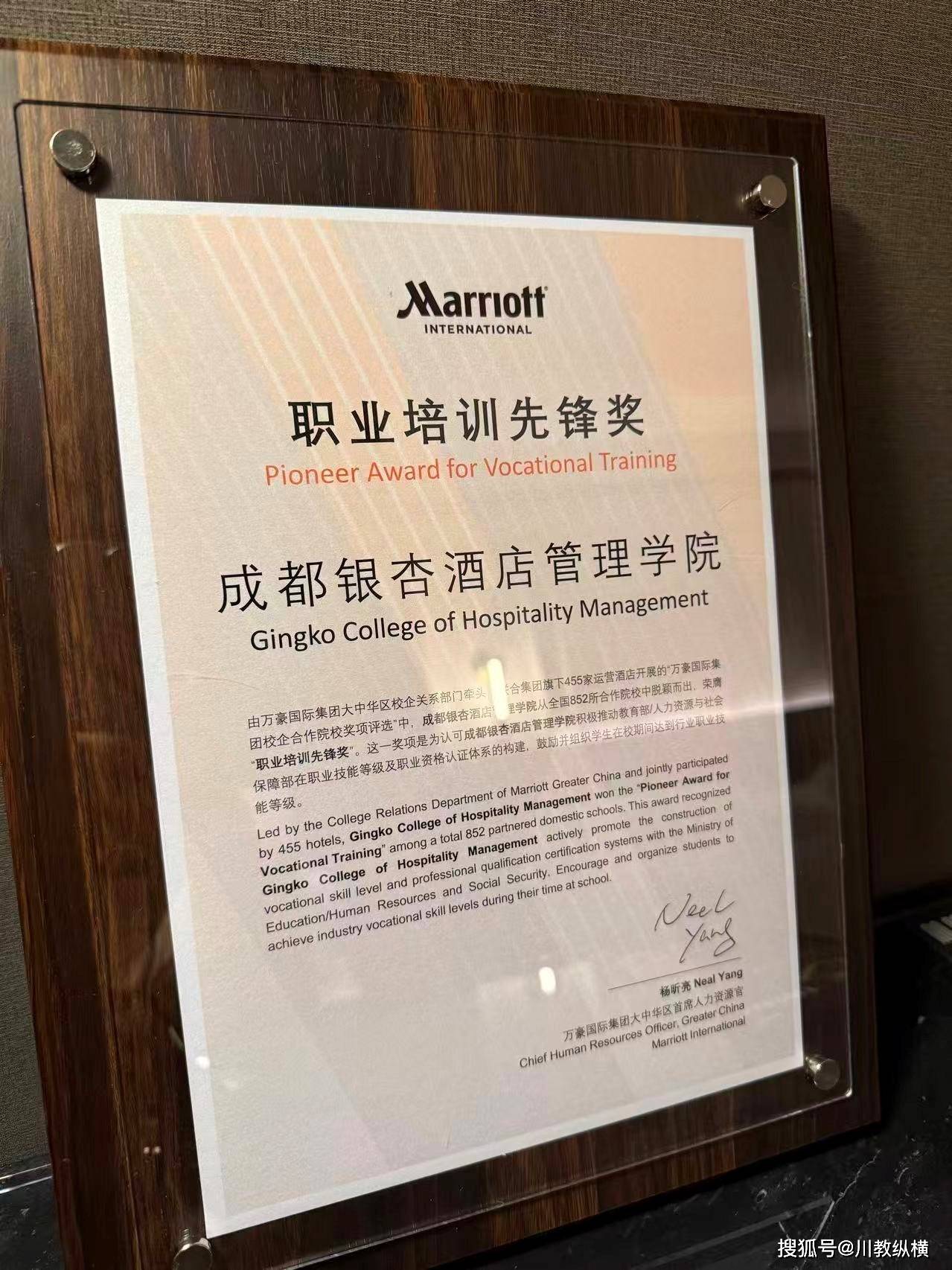 大会期间,在“万豪国际集团校企合作院校奖项评选”中,该校从全国852所合作院校中脱颖而出,斩获“职业培训先锋奖”。该奖项由万豪国际集团大中华区校企关系部门牵头,联合455家运营酒店评选,旨在认可该校积极推动教育部、人力资源与社会保障部职业技能等级及资格认证体系构建,鼓励学生在校期间达成行业职业技能标准的突出成效。