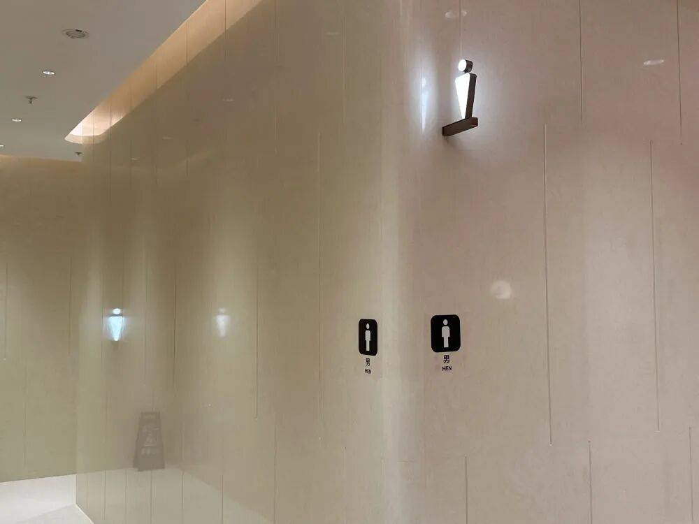 这是11月5日在广西河池市一家商场拍摄的卫生间标识。此处原本只有图形和英文,经顾客反映,商场管理方补充张贴了汉字标注。