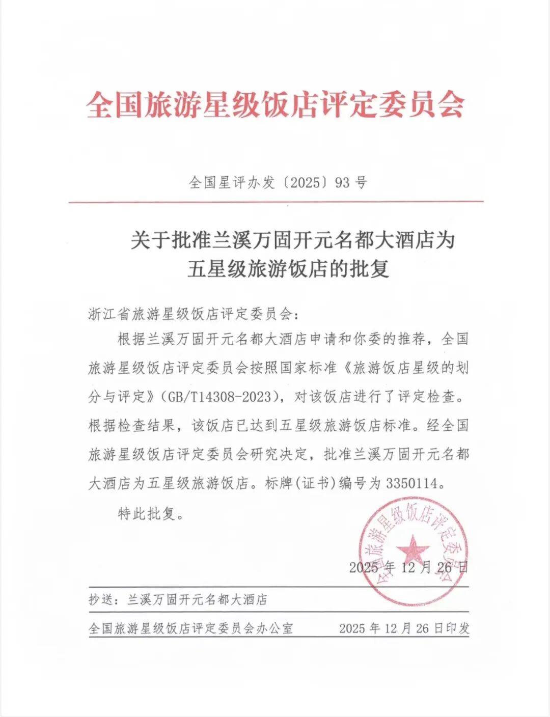 五星闪耀,见证不凡。兰溪万固开元名都大酒店的成功创星,是兰溪文旅服务能级跃升的生动缩影,也将为来兰游客提供更加优质、舒适的住宿体验。未来,兰溪将继续推动更多星级酒店、等级民宿提质增效,助力全域旅游高质量发展!