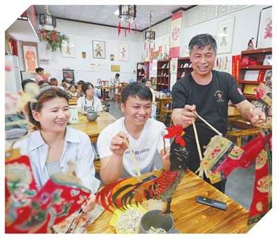 在江西省萍乡市安源区南正街历史文化街区皮影戏馆,游客在皮影戏传承人(右一)指导验传统文化,感受非遗项目的魅力。李桂东摄