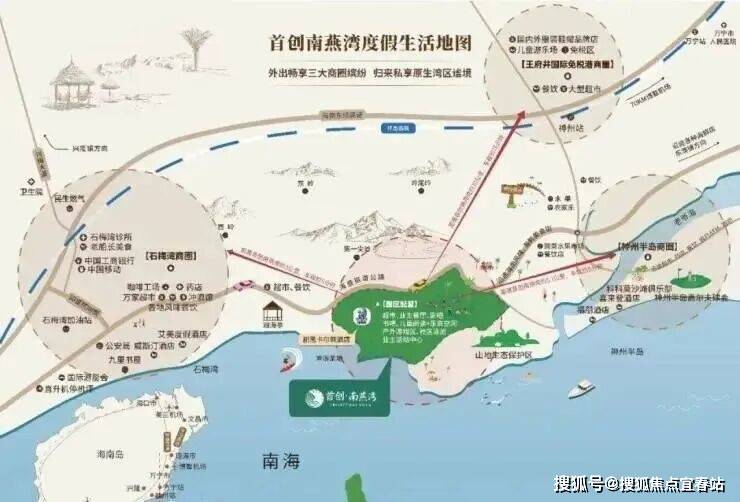 沿109公里海岸线分布的日月湾、石梅湾、南燕湾、神州半岛四大海湾,南燕湾位居其中心,近享威斯汀、艾美、君悦等豪华度假酒店、神州高尔夫、游艇码头等醇熟配套,又独享静谧的一线山海,远离喧嚣。