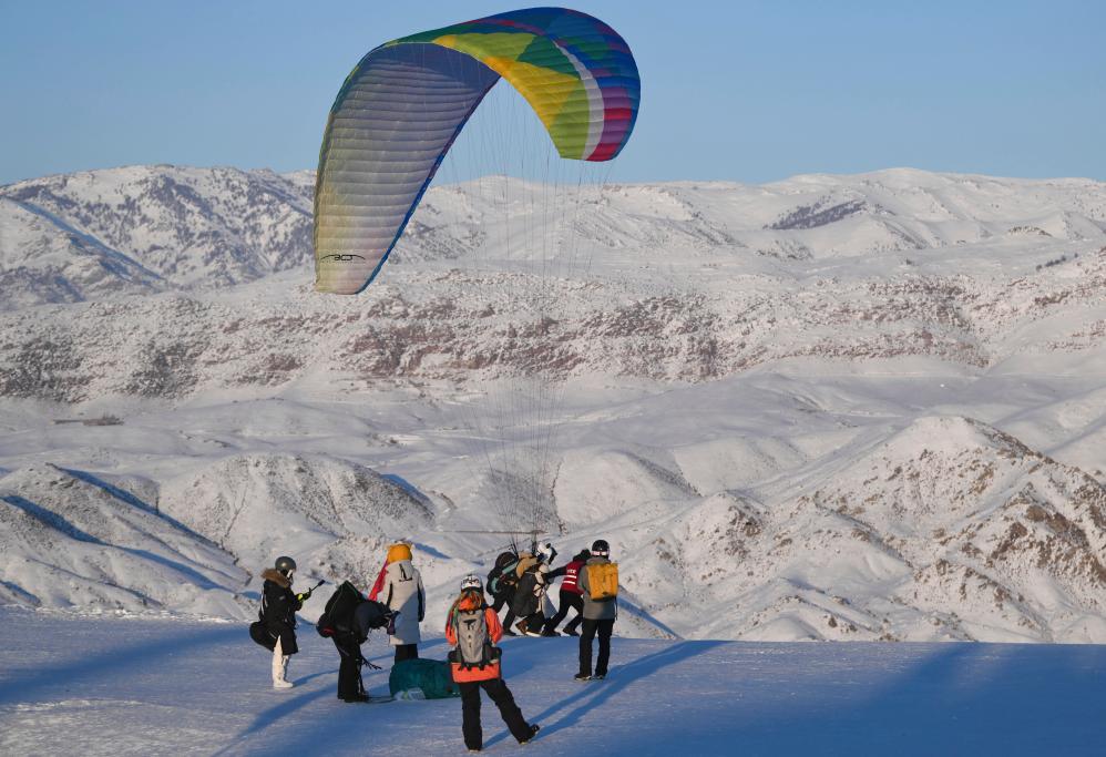 1月24日,游客在将军山国际滑雪度假区体验滑翔伞。