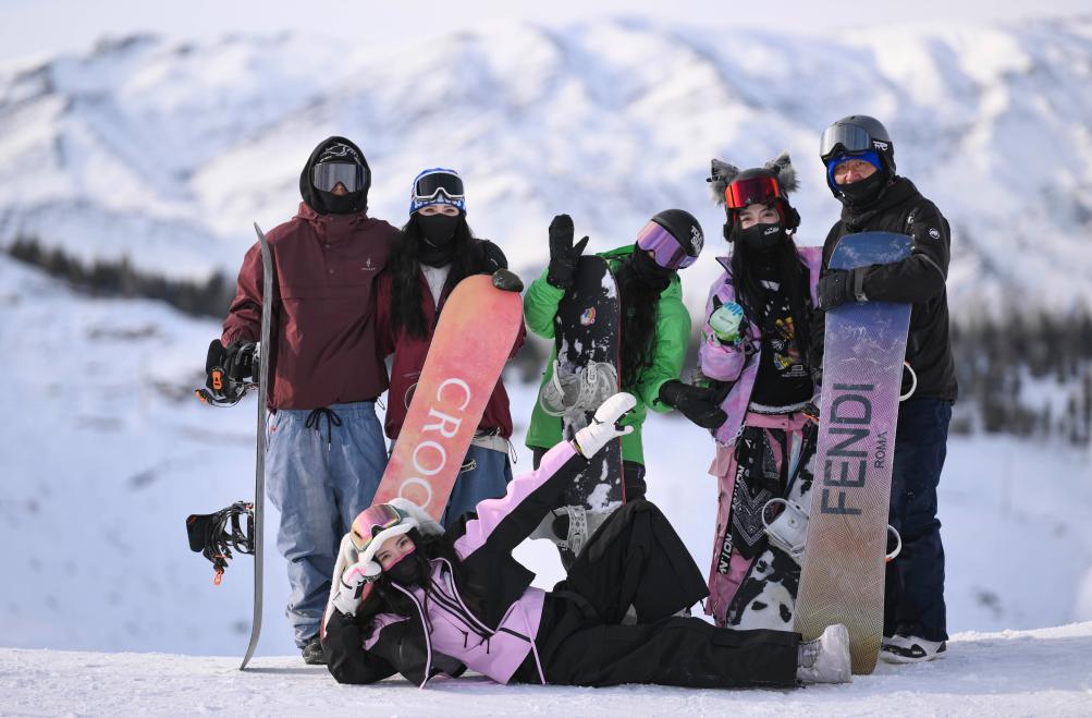 1月28日,来自浙江的“95后”姑娘张琦彬(前)与一起滑雪过年的同伴们在新疆阿勒泰将军山国际滑雪度假区合影。