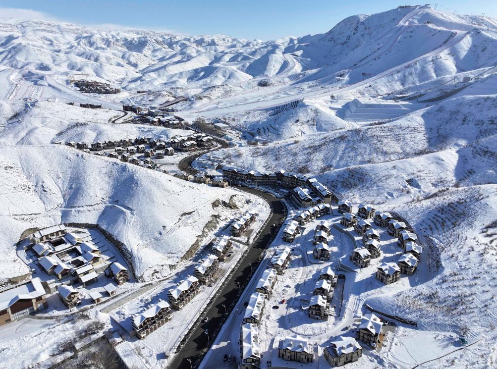 将军山国际滑雪度假区周边的酒店、民宿等商业建筑群(1月24日摄,无人机照片)。