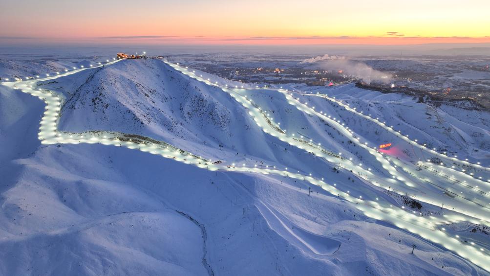 这是1月24日拍摄的黄昏时分的将军山国际滑雪度假区(无人机照片)。