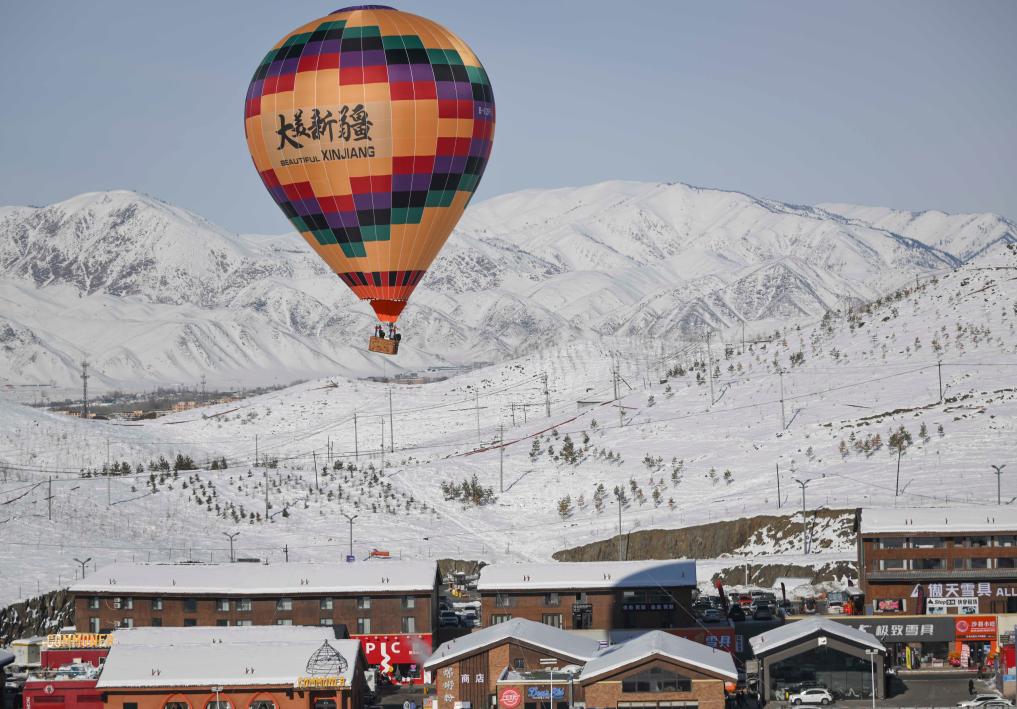 1月25日,游客在将军山国际滑雪度假区乘坐热气球观光。