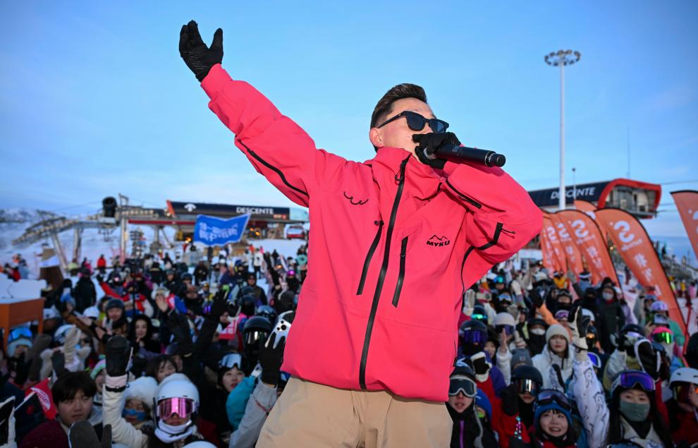 每当日落时分,夕阳余晖映照延绵雪山,粉色与蓝调渐次呈现,分外迷人。在这方由天地搭建的舞台上,中外雪友齐聚雪山之巅,踏着音乐节拍欢快起舞,声浪直抵云霄。