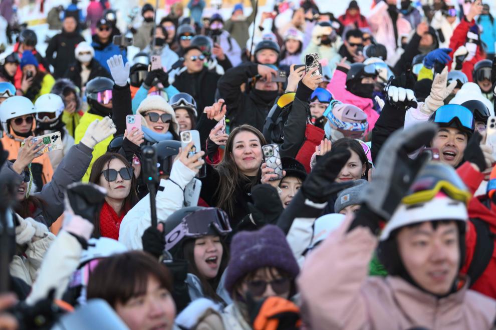 1月28日,游客在阿勒泰将军山国际滑雪度假区的山顶区域参加“夕阳派对”。